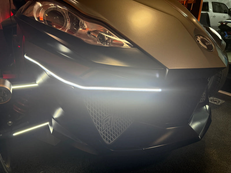 Cette bande de LED blanche de position change à la couleur ambre avec le clignotant. 2 bandes pour compléter le devant et le cote avant de votre Spyder.
