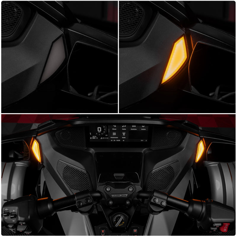 Améliorez la visibilité et la vigilance du chauffeur du Can-Am Spyder RT grâce aux feux de tableau de bord à DEL ambrés TricLED DashFlarez. Ces feux se fixent aux petits panneaux en plastique situés à l'intérieur des rétroviseurs latéraux gauche et droit à l'aide d'un ruban adhésif double face 3M VHB haute résistance, plaçant ainsi l'éclairage directement dans votre champ de vision. Chaque unité DashFlarez fait office de feu de position à DEL ambré et de clignotant ambré. Une fois allumés, les feux de position ambrés améliorent la visibilité latérale et ajoutent une touche d'éclairage moderne et élégante au poste de pilotage. Lorsqu'un clignotant est activé, le feu DashFlarez correspondant clignote en ambrer, signalant clairement votre présence aux autres usagers de la route. Ces feux permettent de signaler clairement un changement de voie. Autre avantage : un retour visuel pour le conducteur. Positionnés à l’avant et au centre, ils servent également de rappel visuel si vous oubliez de désactiver votre clignotant. Conçus initialement comme clignotants uniquement, les feux DashFlarez intègrent également une fonction de feu de position orange. Si besoin, le circuit du feu de position peut être déconnecté, permettant ainsi aux feux de fonctionner uniquement comme clignotants. Chaque feu est logé dans un boîtier en plastique moulé par injection résistant, avec une lentille fumée, pour une discrétion optimale lorsqu’il est éteint et un éclairage orange vif lorsqu’il est allumé. Vendus par paire (gauche et droite), leur installation est simple et rapide (Plug & Play). Un kit de faisceau d’alimentation TricLED est nécessaire pour une alimentation correcte et est vendu séparément.